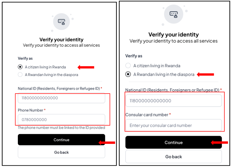- If you are a Rwandan living in the diaspora, you will be required to use a Rwandan national ID and a consular card number. Click on “continue” to proceed.