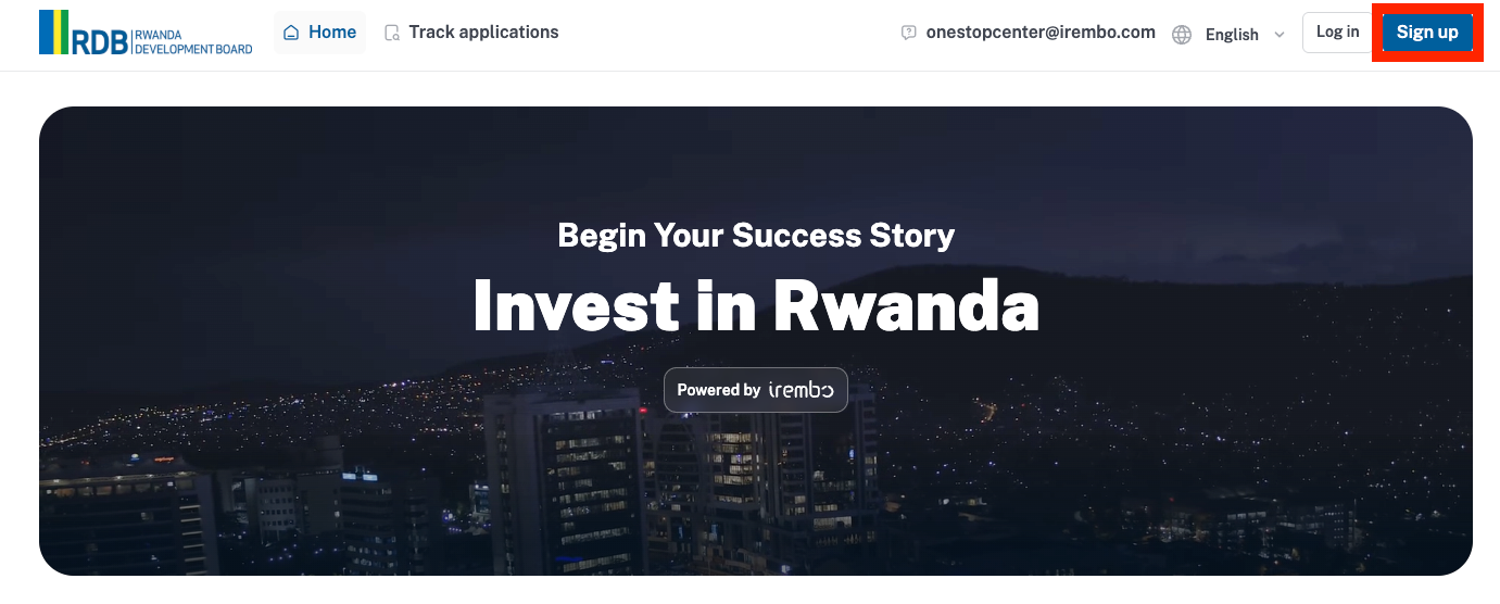 Visit RDB Onestopcenter platform:onestopcentre.rdb.rw and click on Sign up
