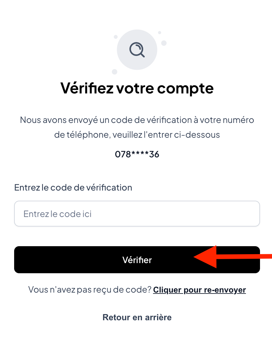 Vérification du compte : Un code de vérification/mot de passe à usage unique (OTP) vous est envoyé sur votre numéro de téléphone par notification SMS ou par e-mail. Saisissez l'OTP et cliquez sur « Vérifier ».