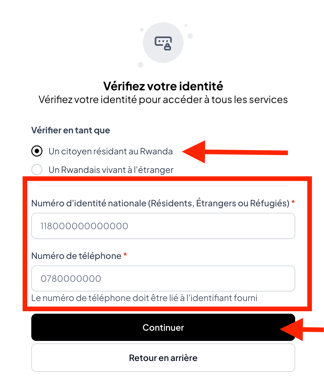 -Un citoyen résidant au Rwanda (vous devrez utiliser une carte d'identité nationale Rwandaise et un numéro de téléphone). Cliquez sur « Continuer » pour poursuivre.