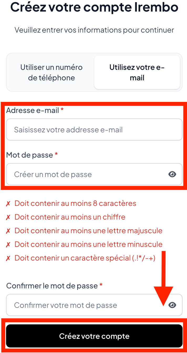 Soumettez les informations requises : Entrez votre numéro de téléphone ou votre adresse e-mail et votre mot de passe, confirmez-le, puis cliquez sur "Créer un compte".