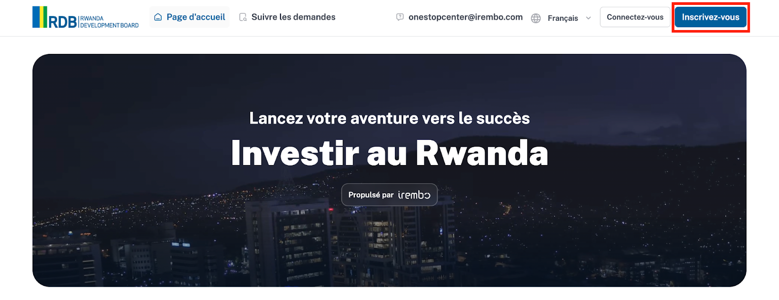 Visitez la plateforme RDB: One stop center: onestopcentre.rdb.rw et cliquez sur Inscrivez-vous.