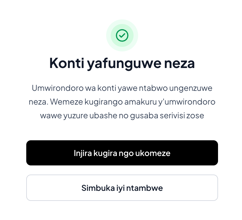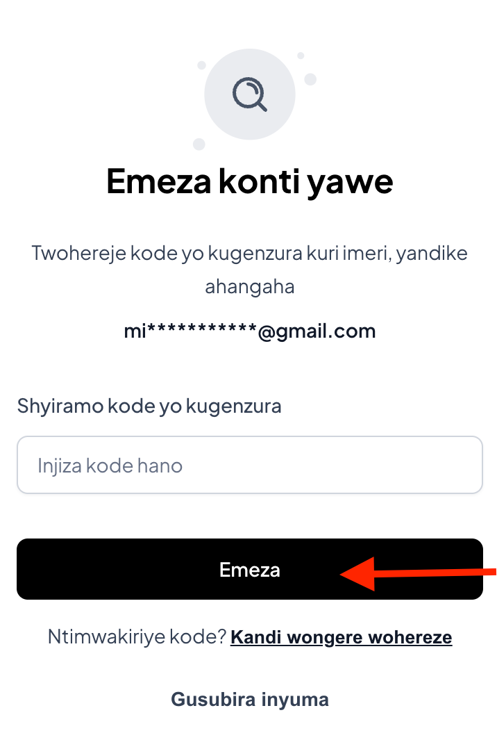 Isuzuma rya konti: Kode yo gusuzuma/OTP yoherezwa kuri telefone cyangwa imeli yawe binyuze mu butumwa bugufi . Shyiramo kode woherejwe maze ukande kuri Emeza.