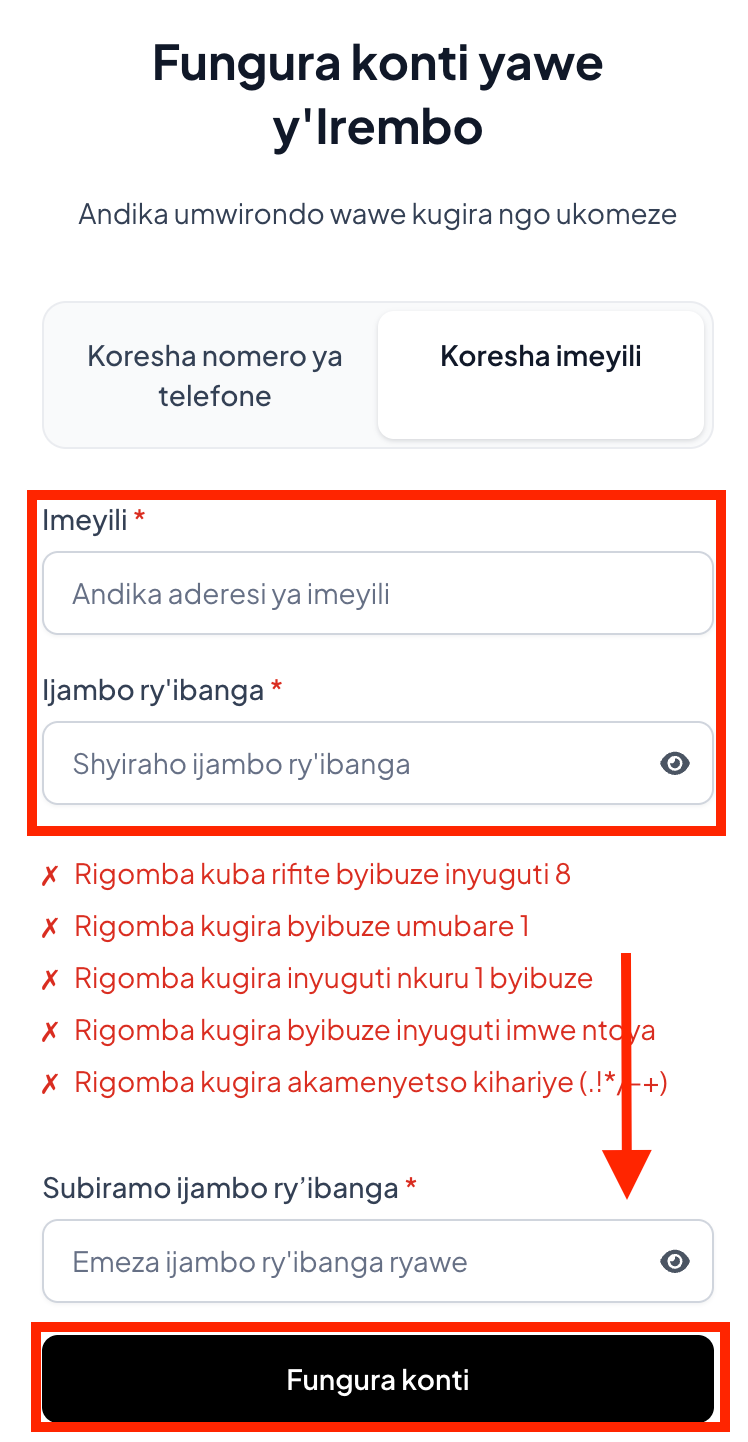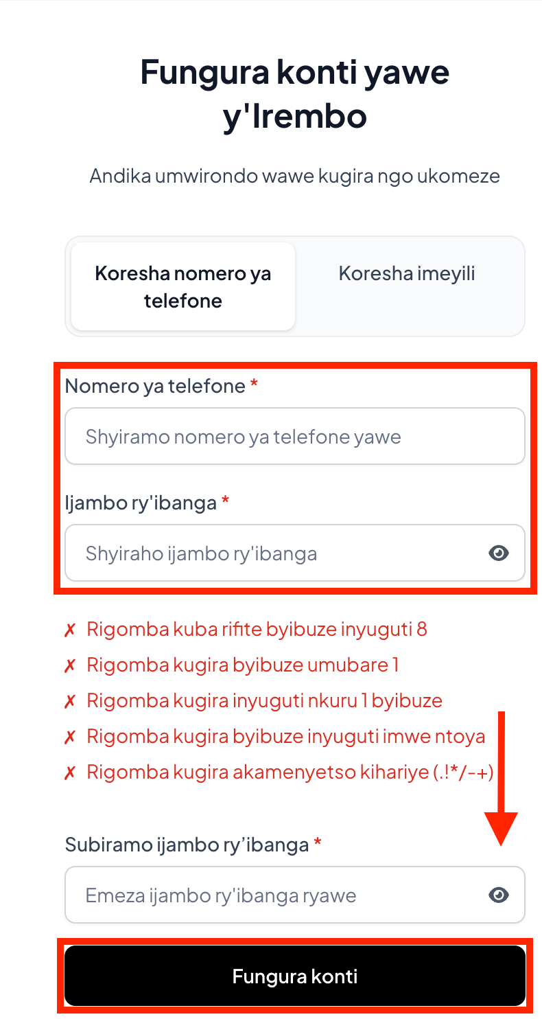 Icyitonderwa: Ijambo ry’ibanga rigomba kuba rifite byibuze inyuguti 8, harimo byibuze umubare 1, inyuguti nkuru 1 byibuze, inyuguti imwe ntoya n’akamenyetso kihariye (.!*/-+)